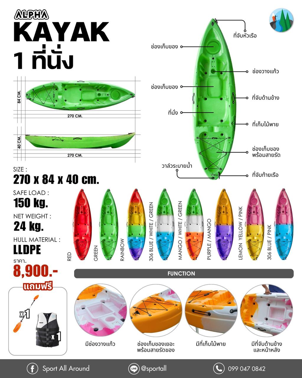 เรือคายัค 1 ที่นั่ง ราคาเพียง 8,900 บาท พร้อมแถมฟรี ไม้พายคายัค 1 ด้าม และ เสื้อชูชีพ 1 ตัว