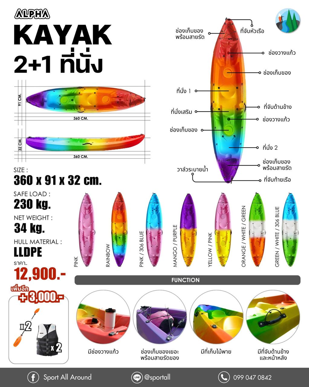 เรือคายัค 2+1 ที่นั่ง ราคาเริ่มต้น 12,900 บาท พิเศษสุดๆ จ่ายเพิ่มเพียง 3,000 บาท รับเลยทันที ไม้พายคายัค 2 ด้าม และ เสื้อชูชีพ 2 ตัว จากราคาปกติ 3,878 บาท